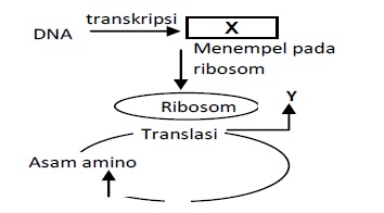 Berdasarkan skema sintesis protein tersebut bagian yang ditunjuk yang ditunjuk oleh X dan Y secara urut merupakan molekul....